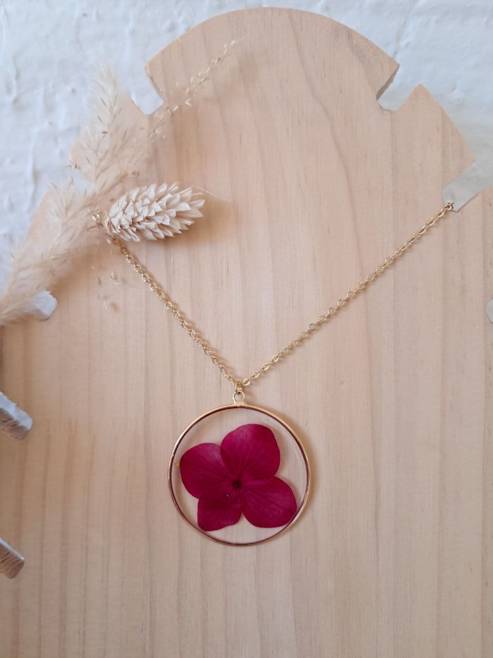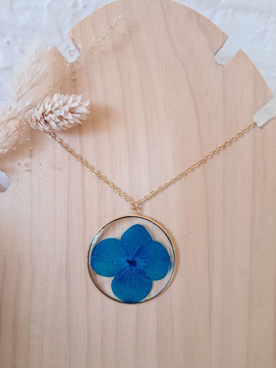 Collier rond (grand pendentif) en acier inoxydable avec inclusion de fleurs séchées