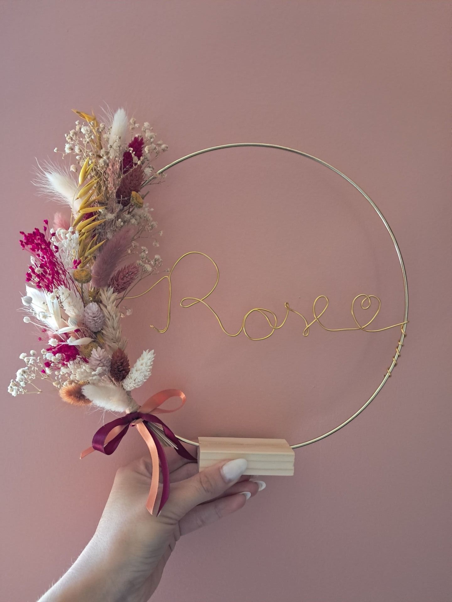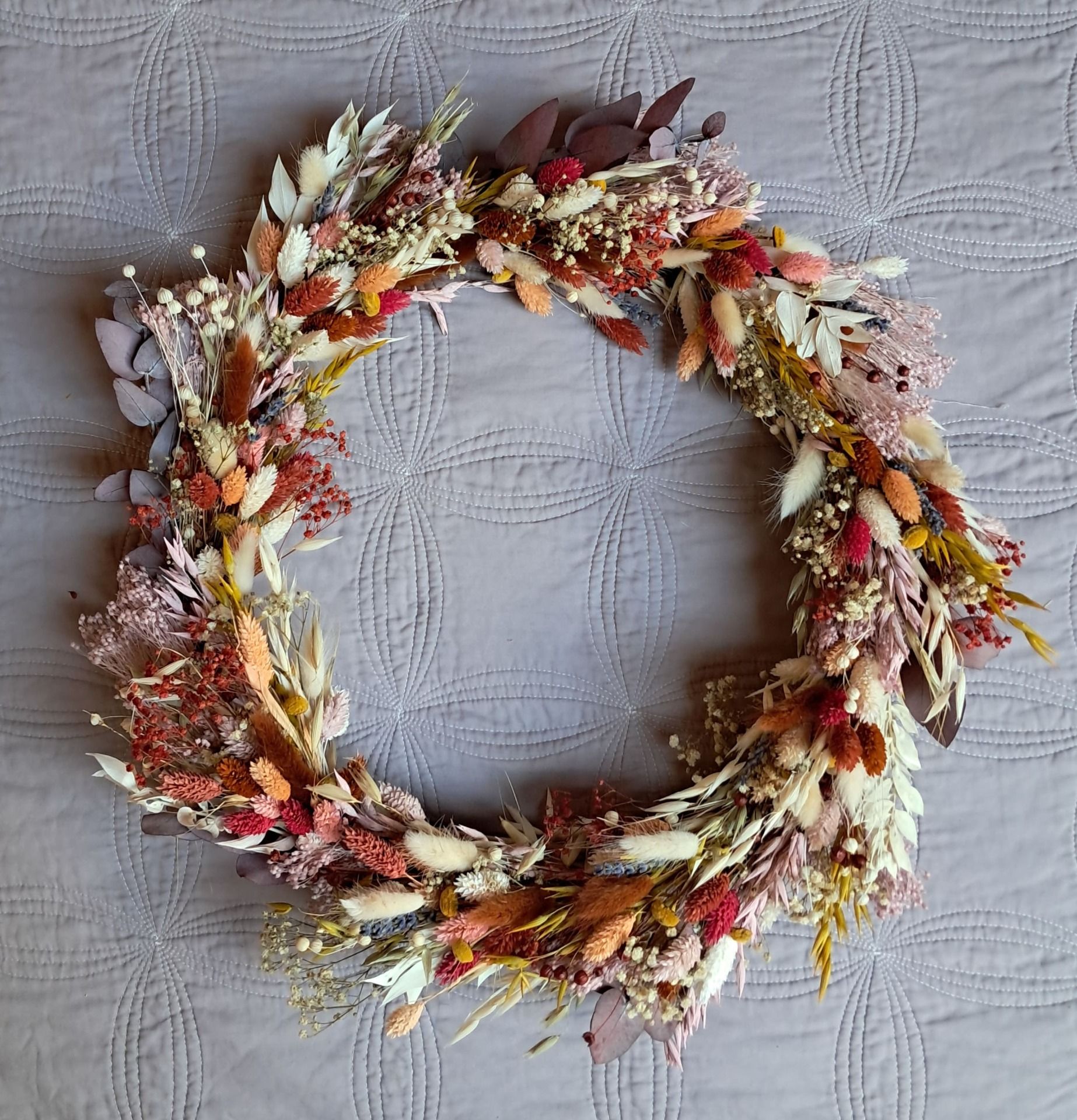 4 dimensions au choix: 25cm / 30cm / 35cm / 40cm. Si vous souhaitez une dimension de couronne différente de ce que je proprose ou un projet en particulier, envoyez moi un message (formulaire de contact/mail/insta).