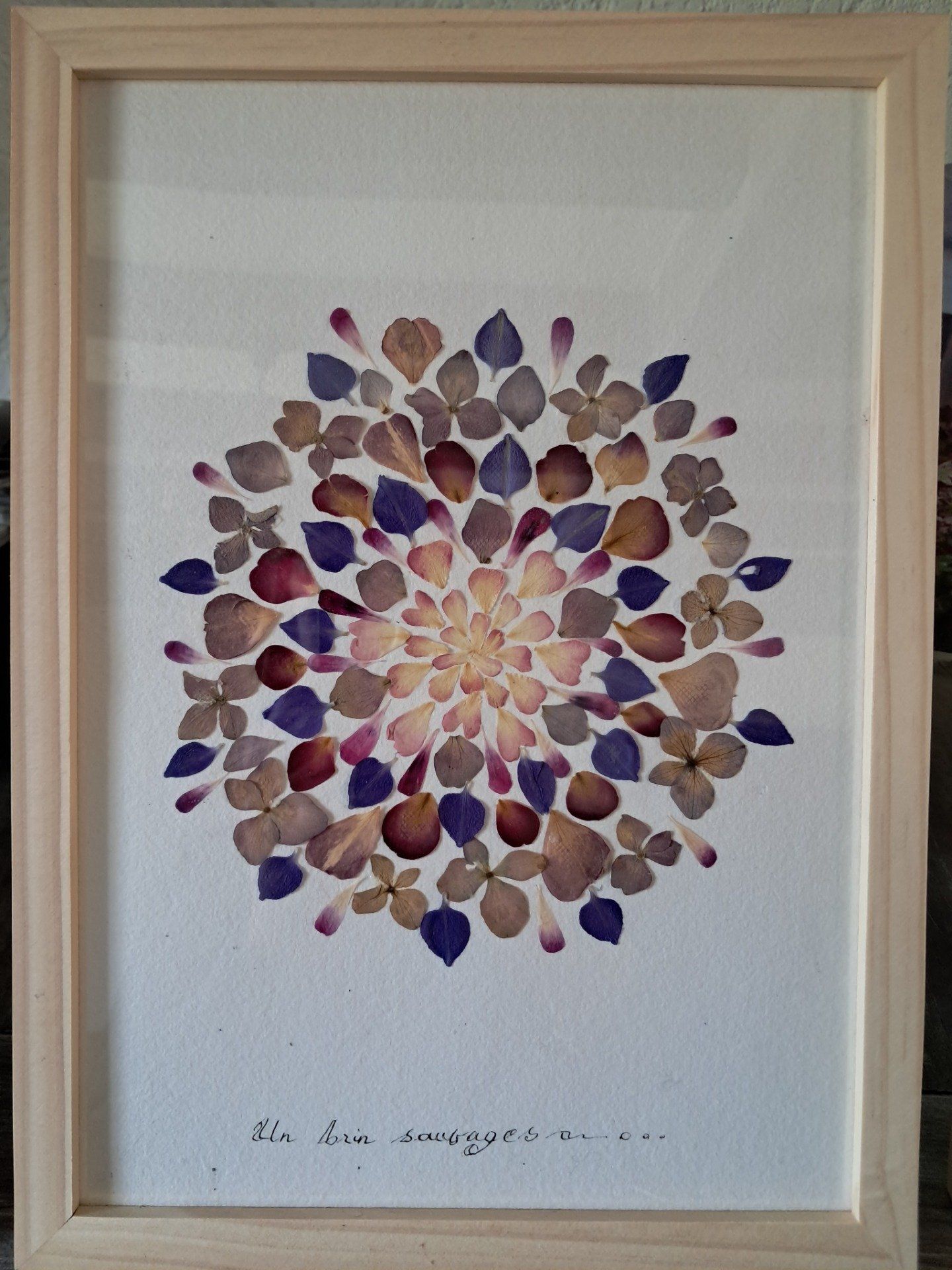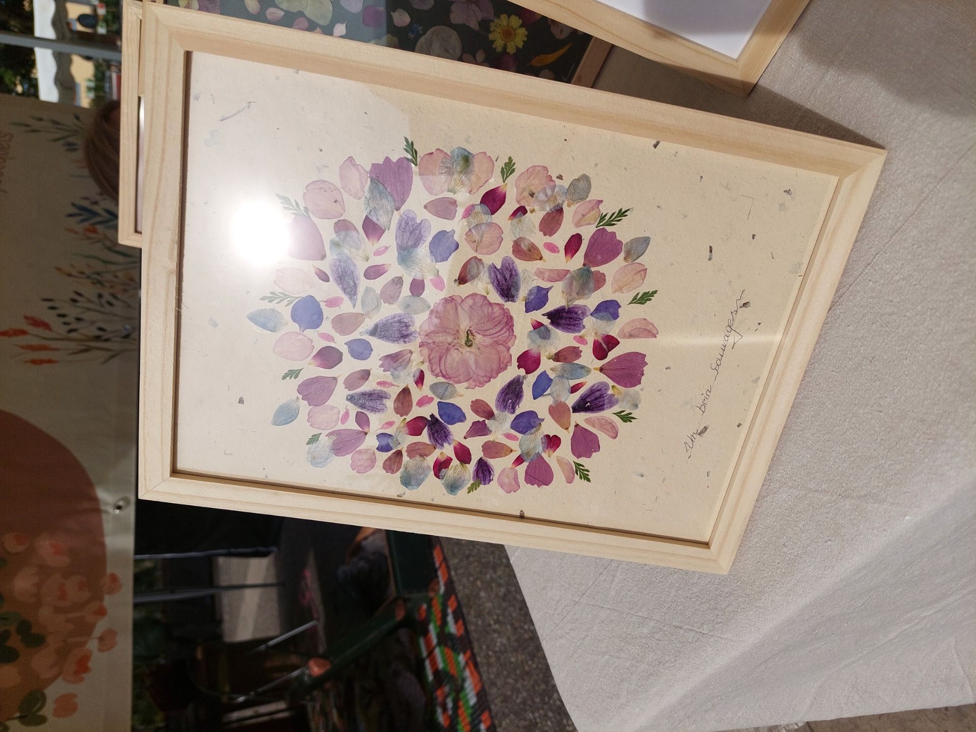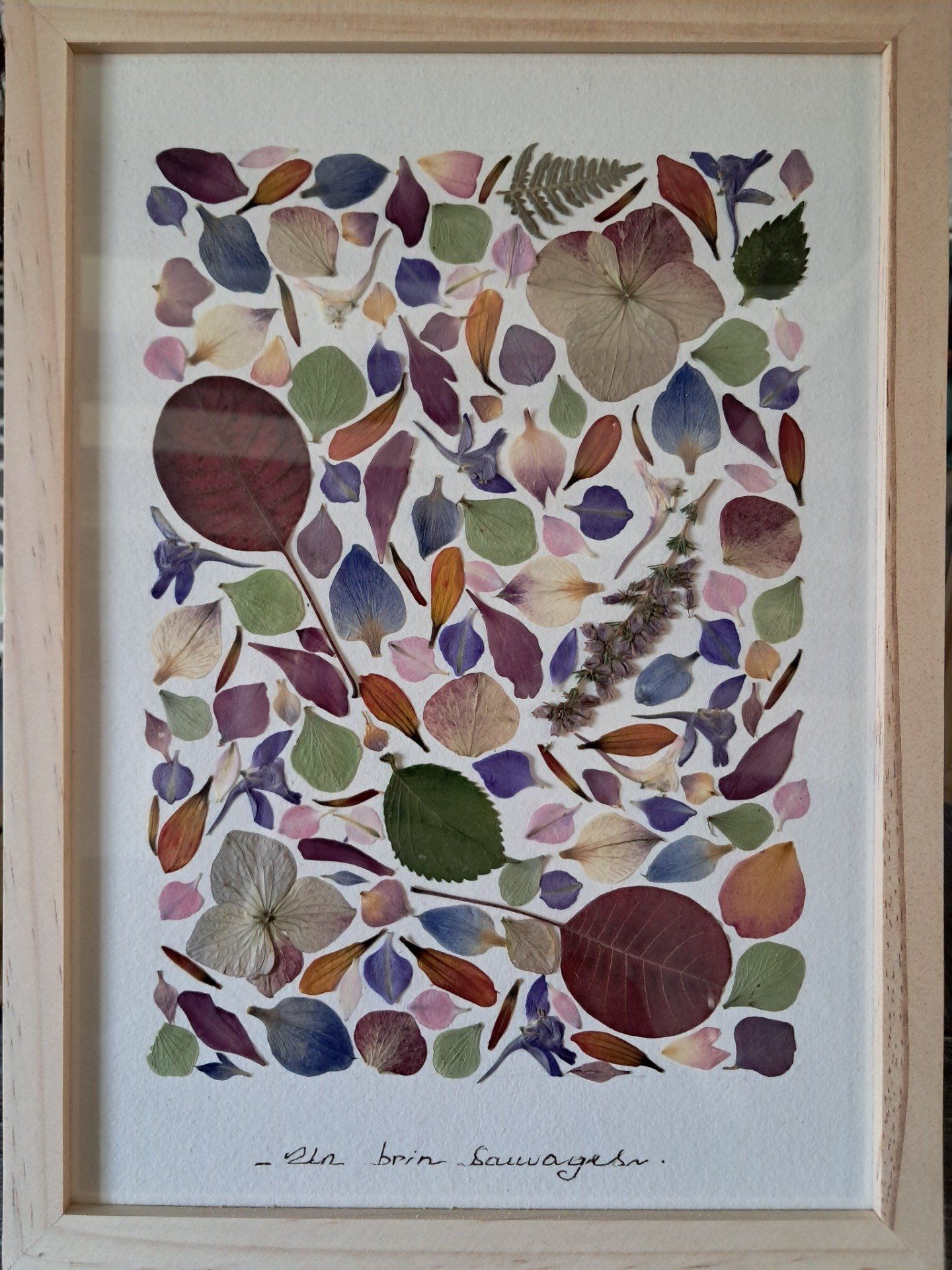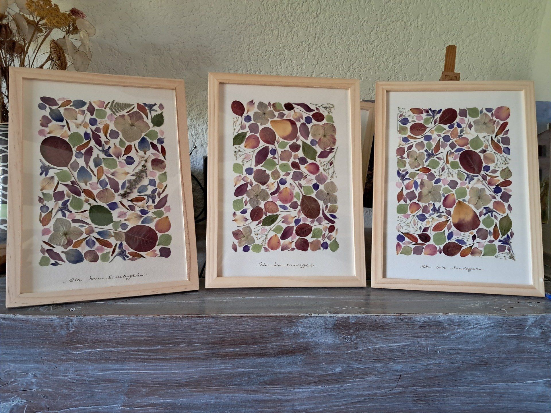 Tous les herbiers contiennent de véritables fleurs que j’ai moi-même cueillies (ou bien achetées en France), mises sous presse, séchées puis délicatement collées sur le tableau.