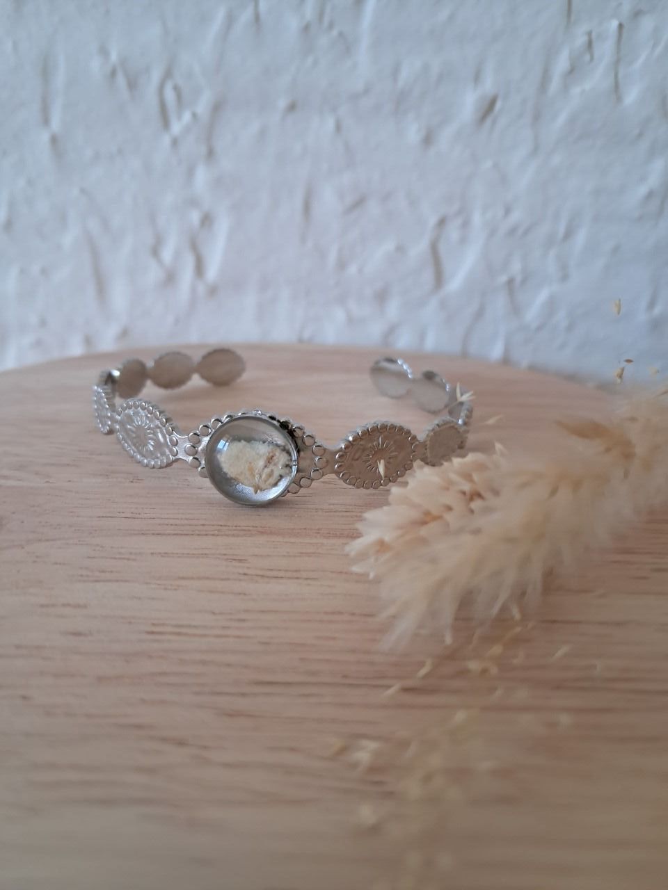 Jonc réglable "ethnique ovale" en acier inoxydable argenté avec inclusion de fleurs séchées