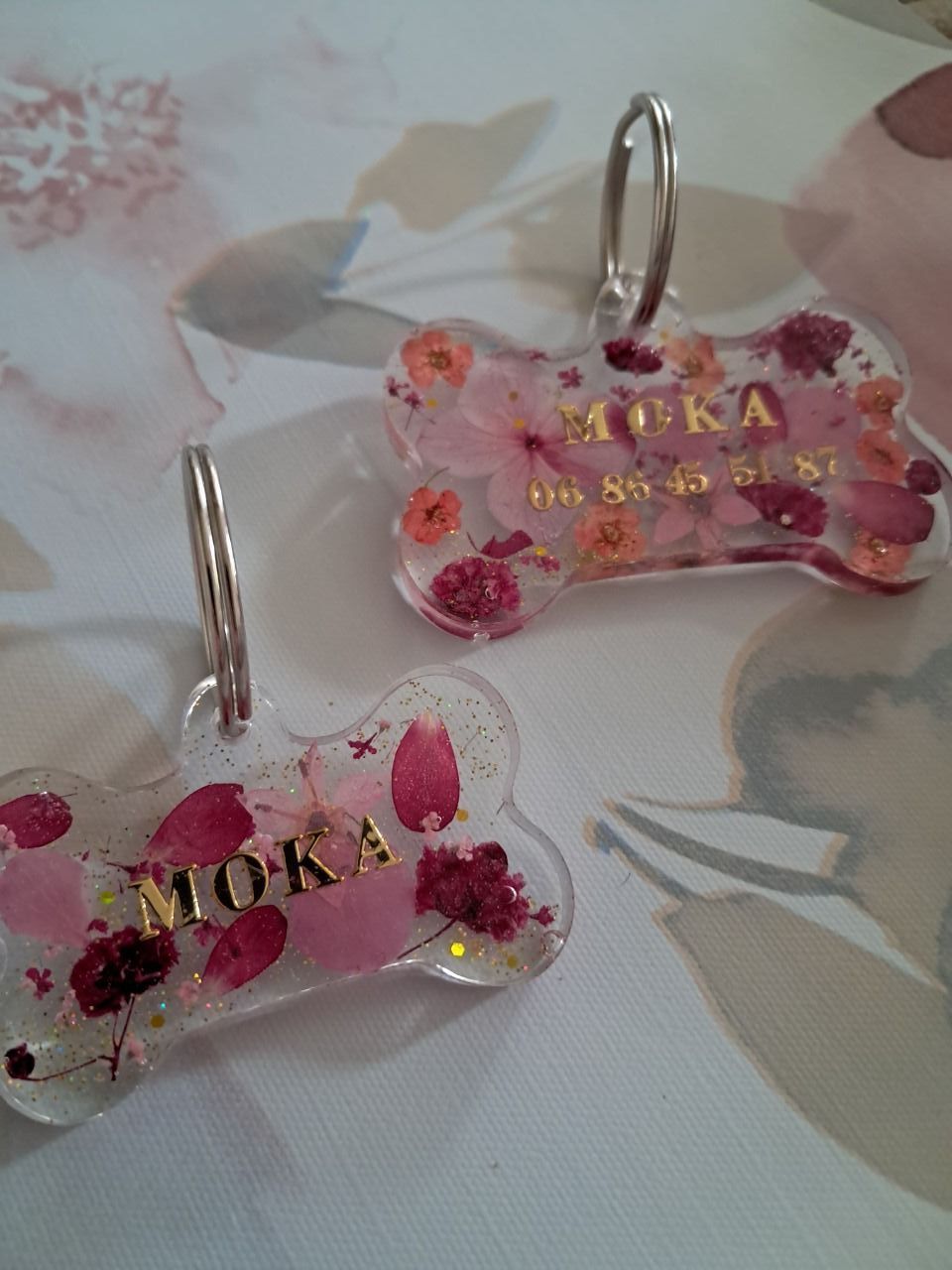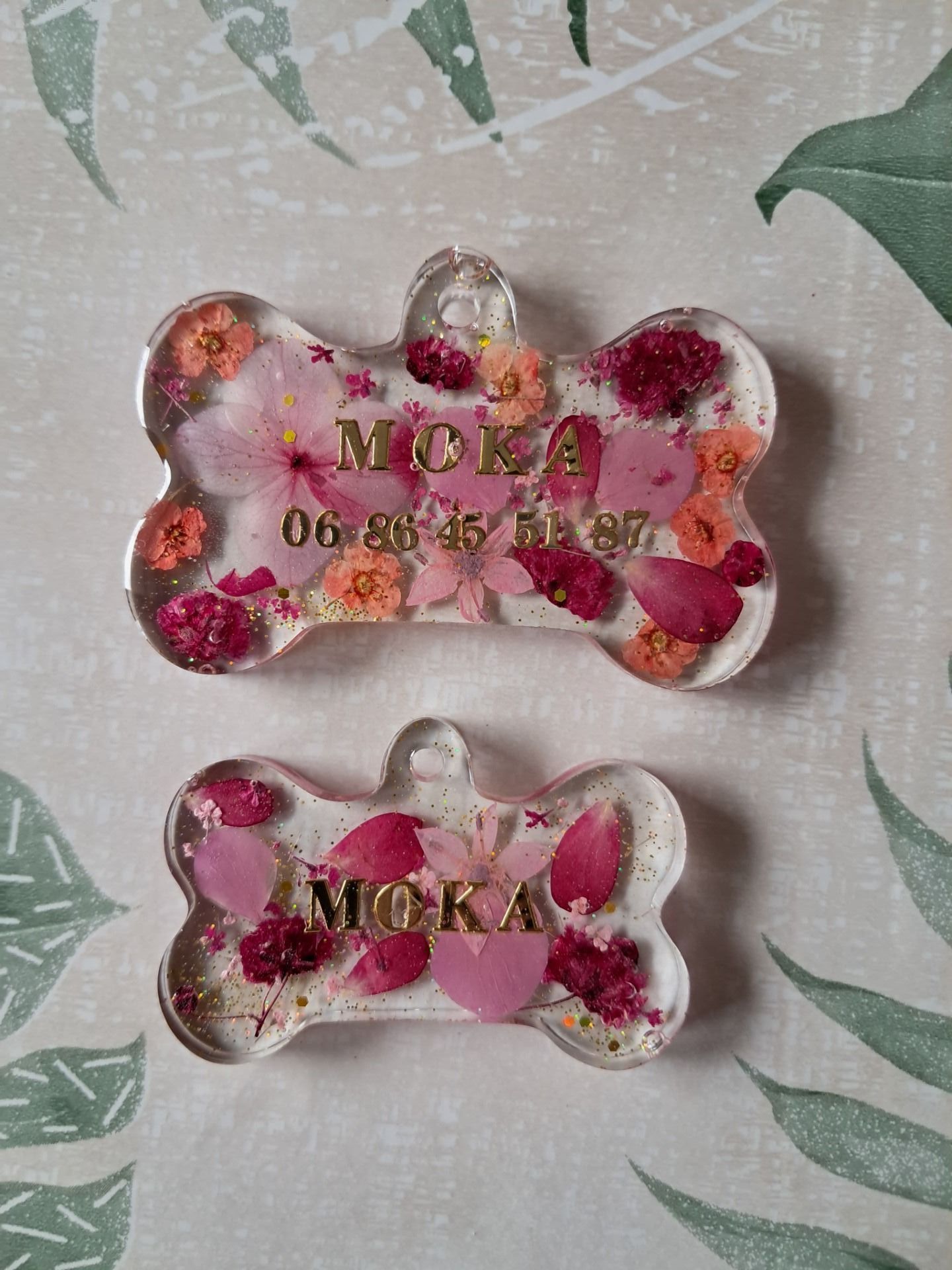 🐶 Médaille pour chien personnalisée, en résine époxy et fleurs séchées.