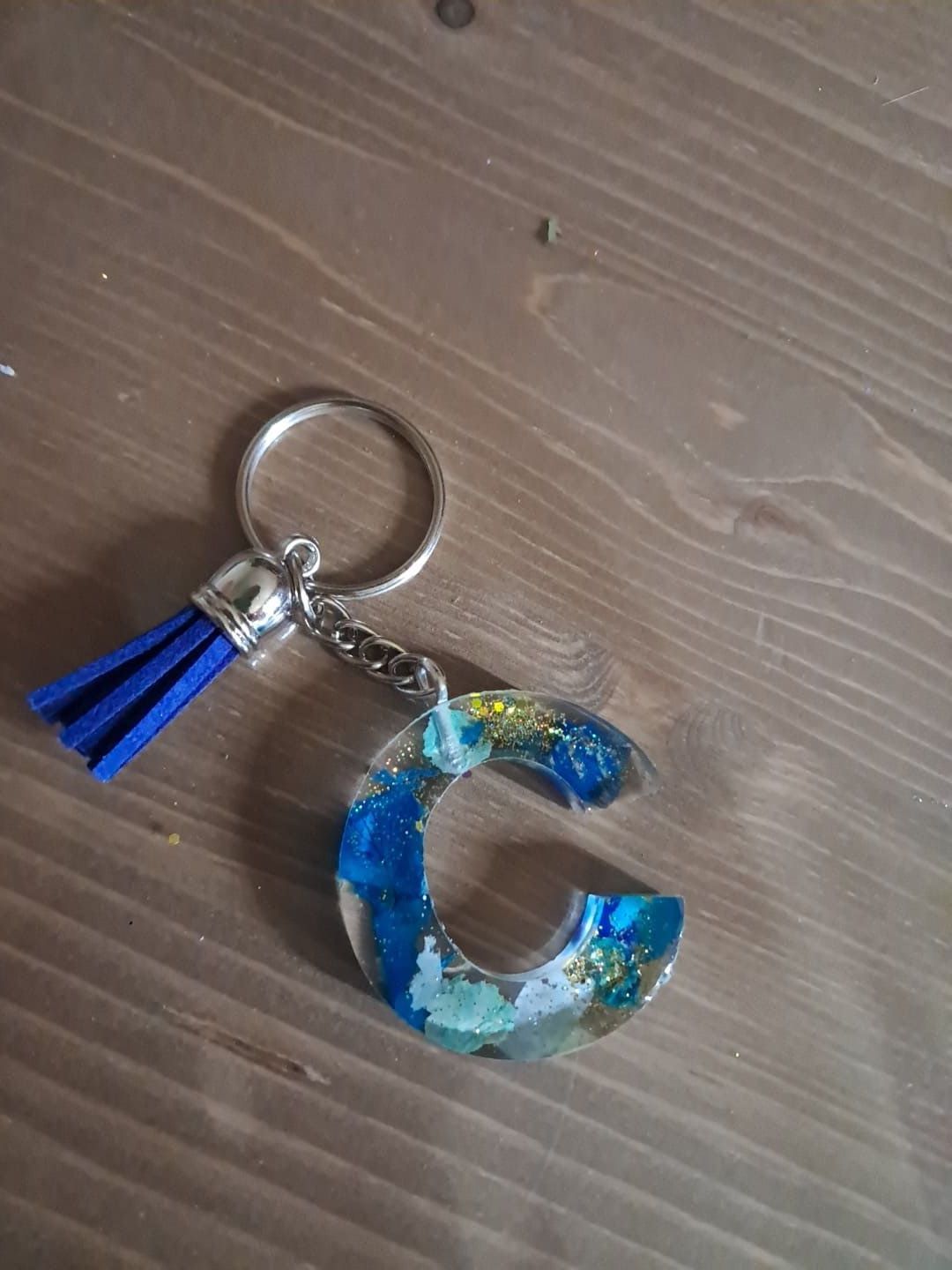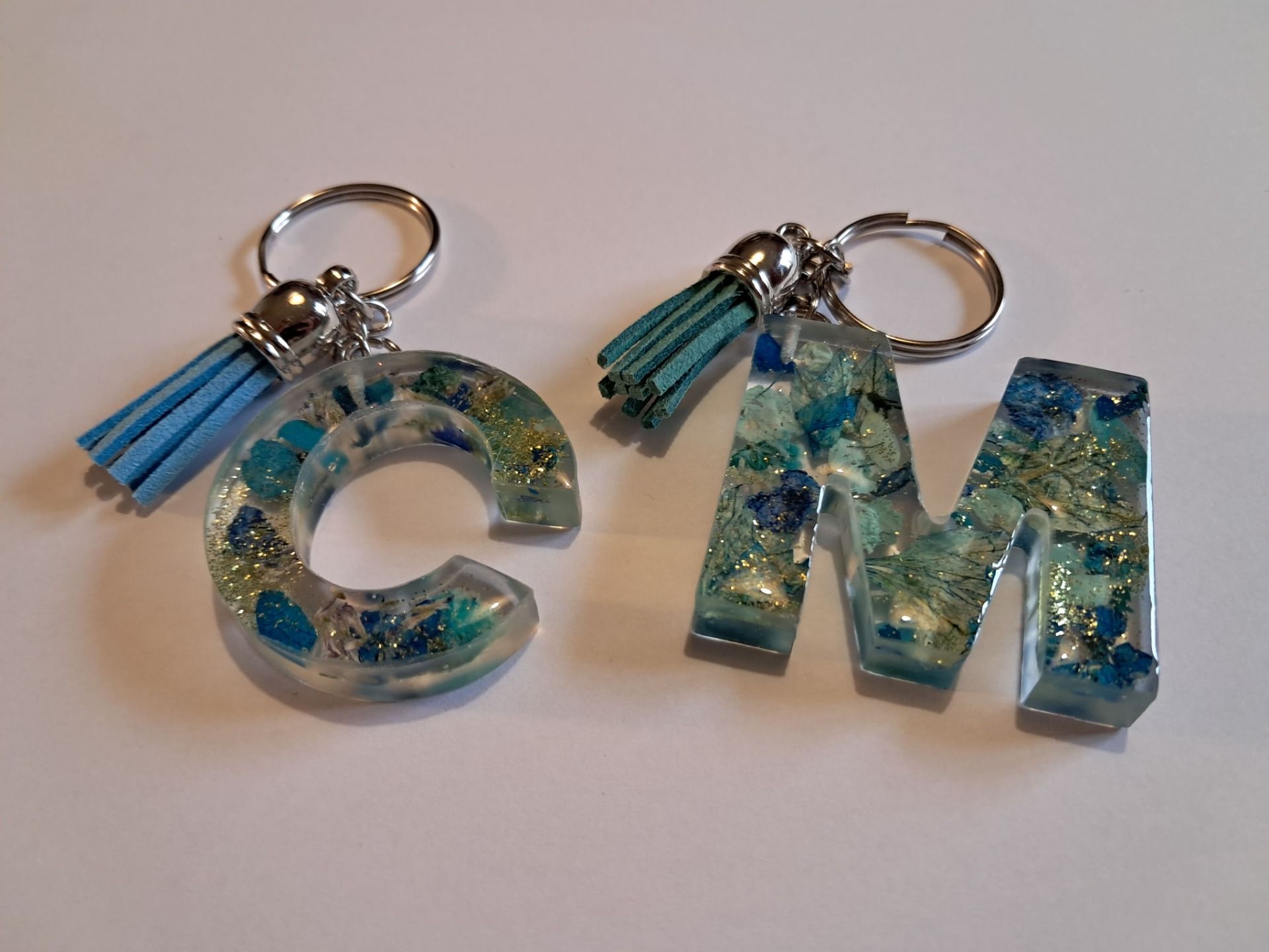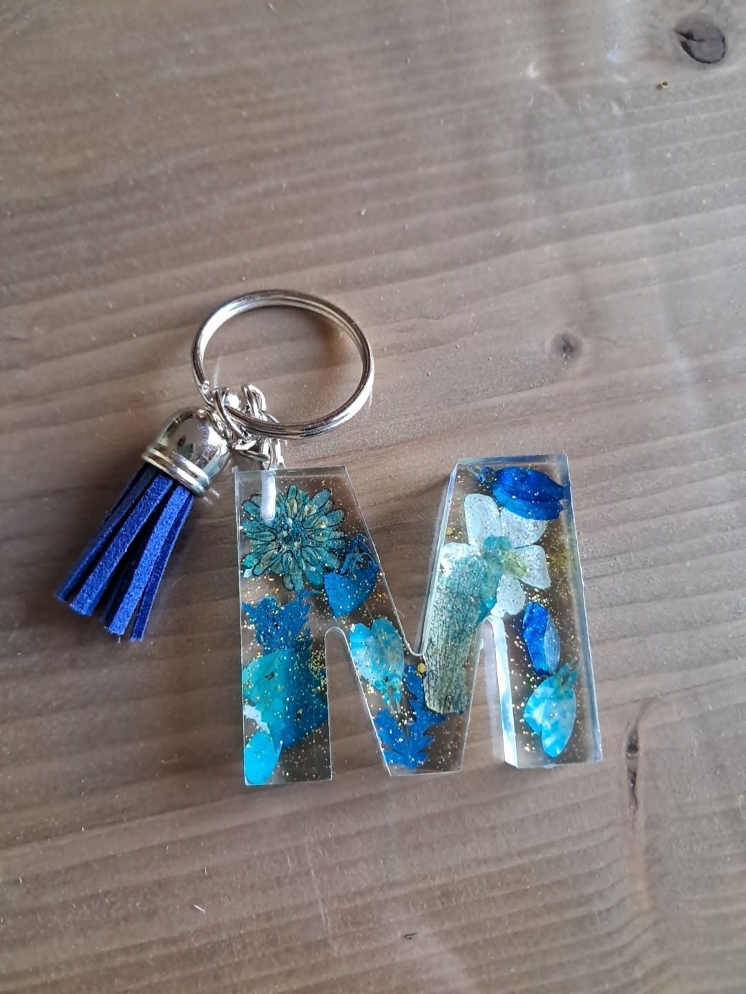 Porte-clé initiale en résine avec inclusion de fleurs séchées